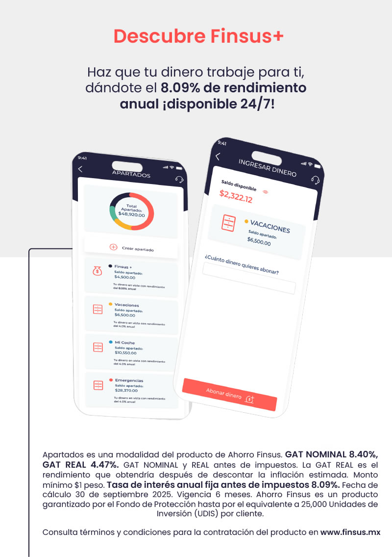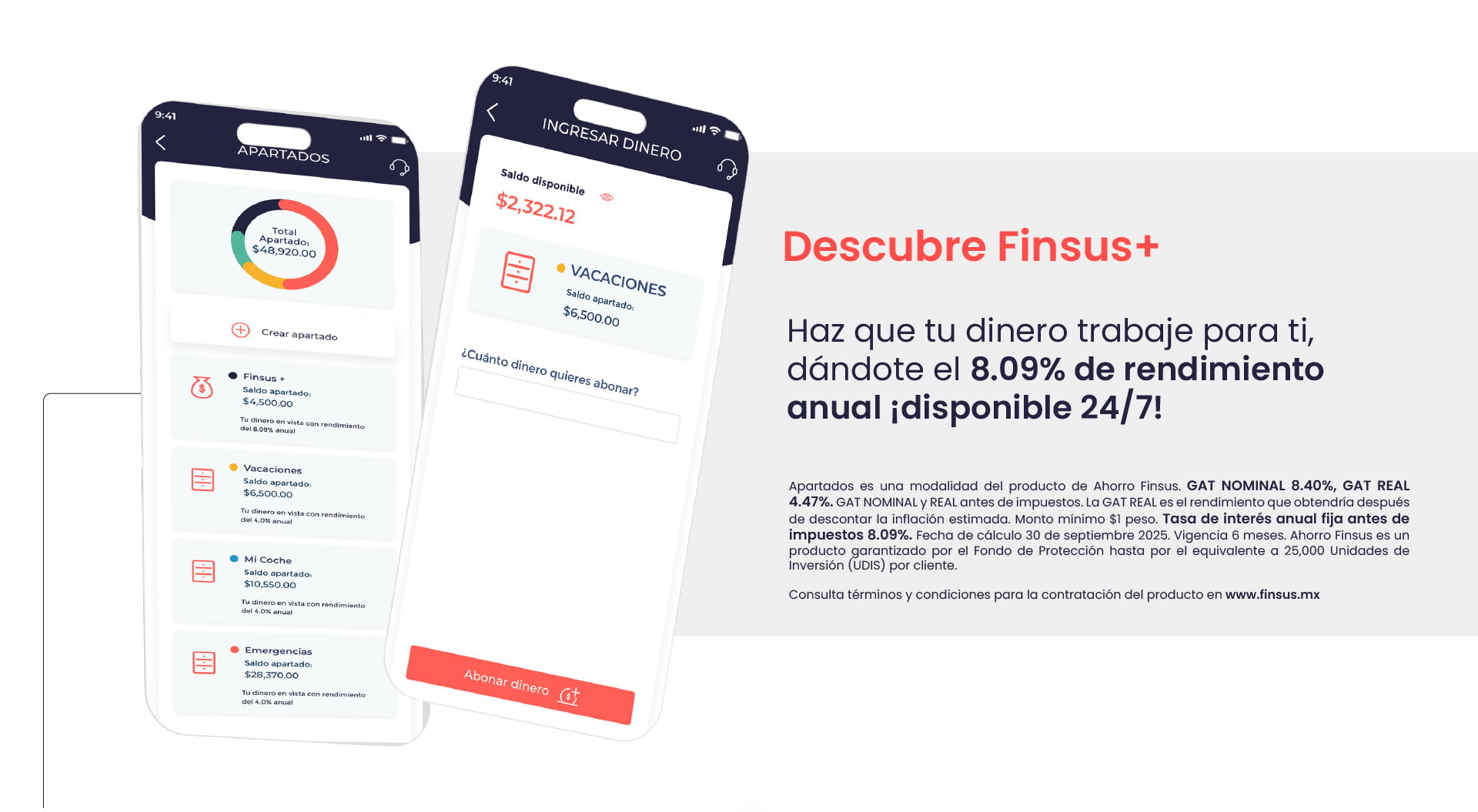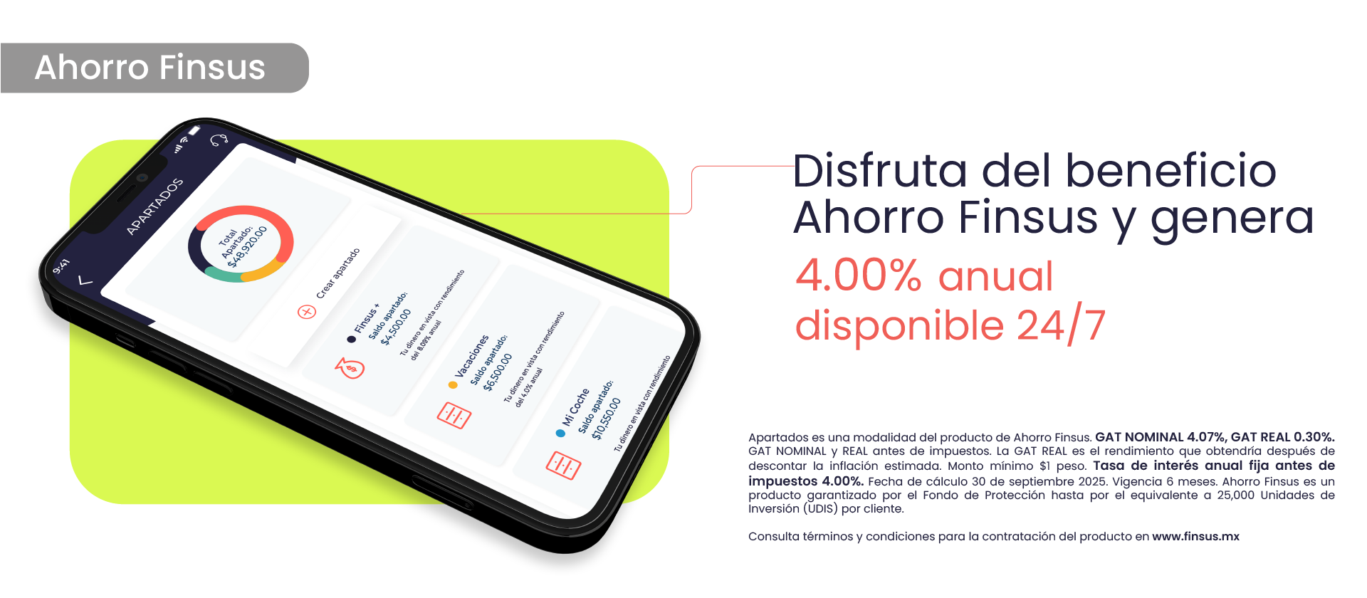 En la sección de “Apartados”, encontrarás “finsus+”. En este apartado, podrás mantener tu dinero disponible 24/7, con un rendimiento del 8.09% anual.