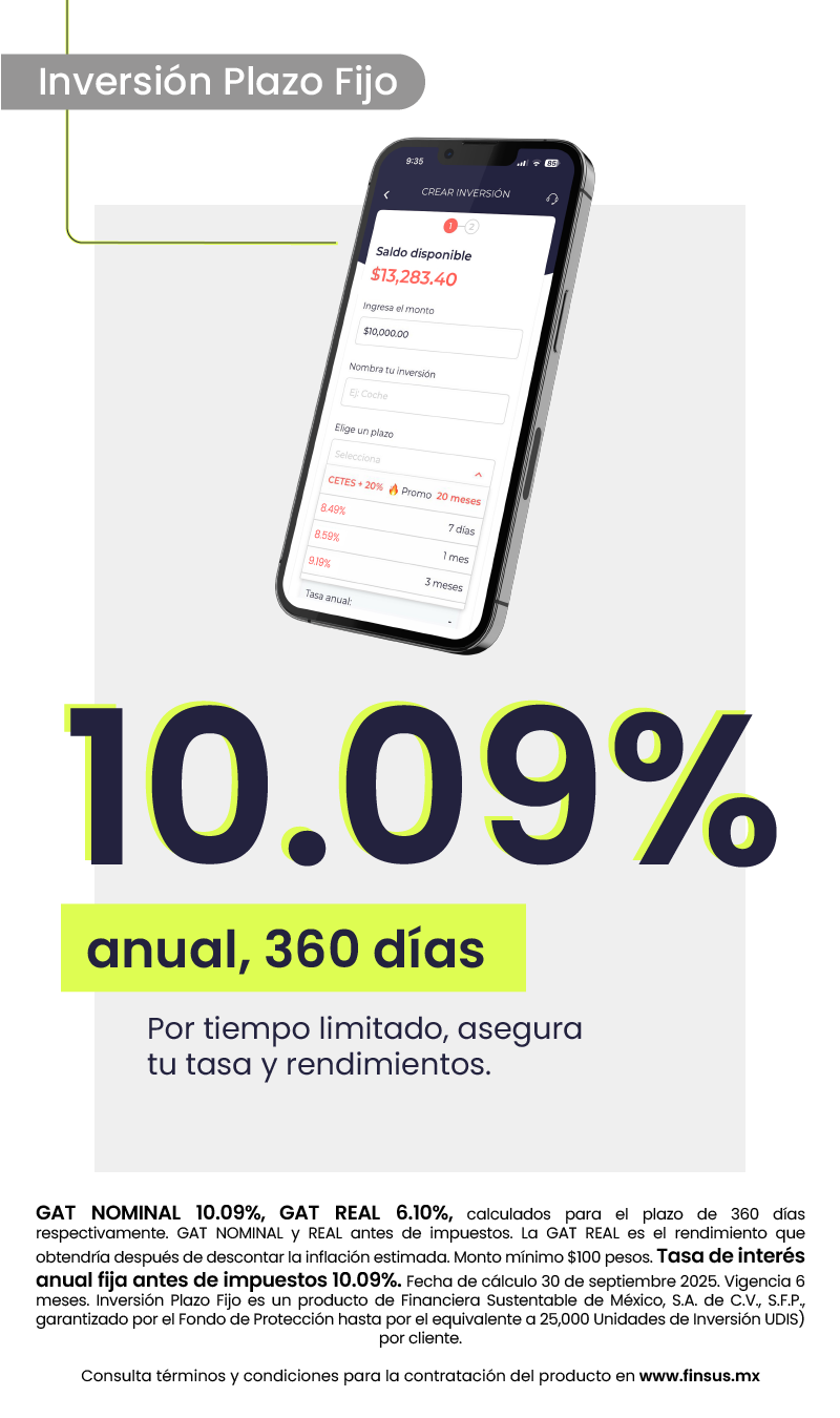 - Inversión Plazo Fijo es un producto de Financiera Sustentable de México, S.A. de C.V., S.F.P., garantizados por el Fondo de Protección hasta por el equivalente a 25,000 Unidades de inversión (UDIS) por cliente, consulta términos y condiciones para su contratación en esta página.