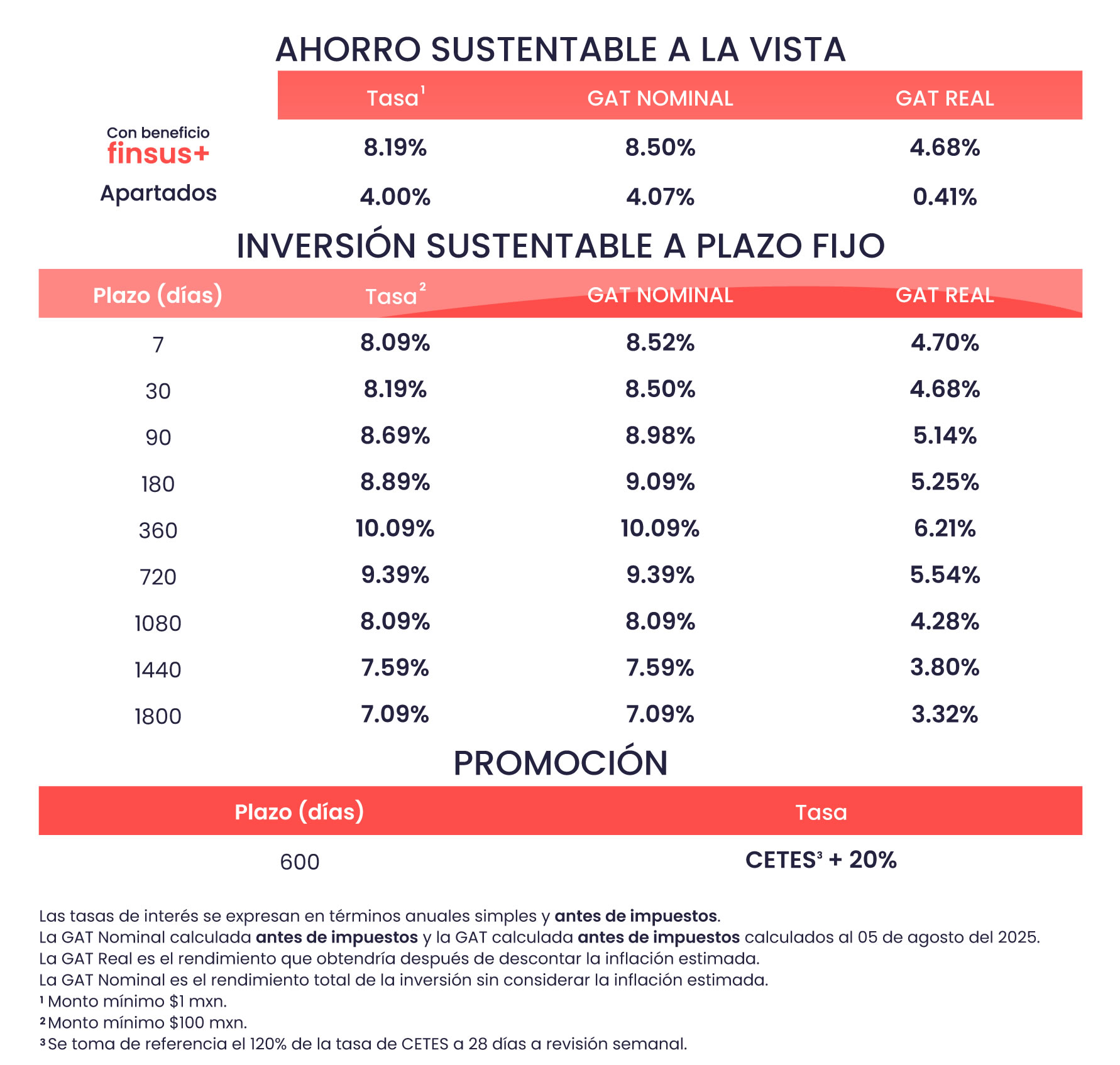 Las tasas se actualizan de acuerdo con una decisión de mercado y atendiendo una estrategia de Dirección General. Estas pueden cambiar sin previo aviso para nuevas inversiones, es decir, que al tener una inversión ya contratada y la tasa cambia, se respetará la tasa original contratada.
